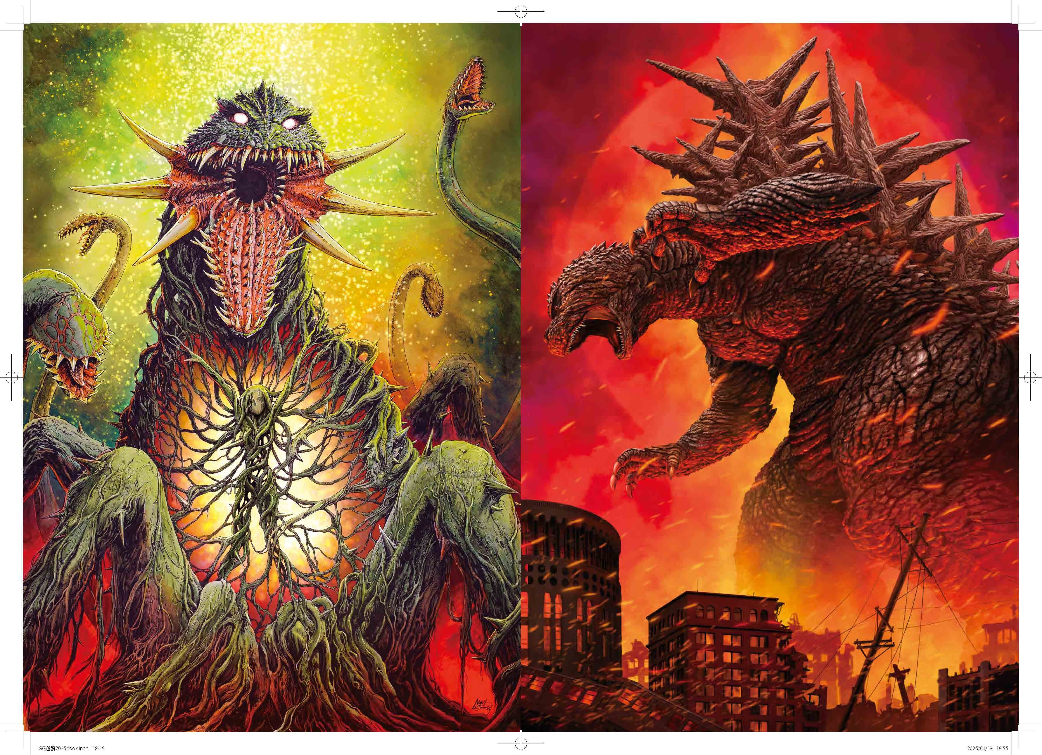 左開きの展開は、舞台を東京に移した『GODZILLA GENERATIONの逆襲 開田裕治×西川伸司』で展示された2022年以降の『ゴジラ-1.0』までの二人の作品を収録。ゴジラ70周年を彩る『GODZILLA GENERATIONの逆襲 開田裕治×西川伸司』のブックレット。