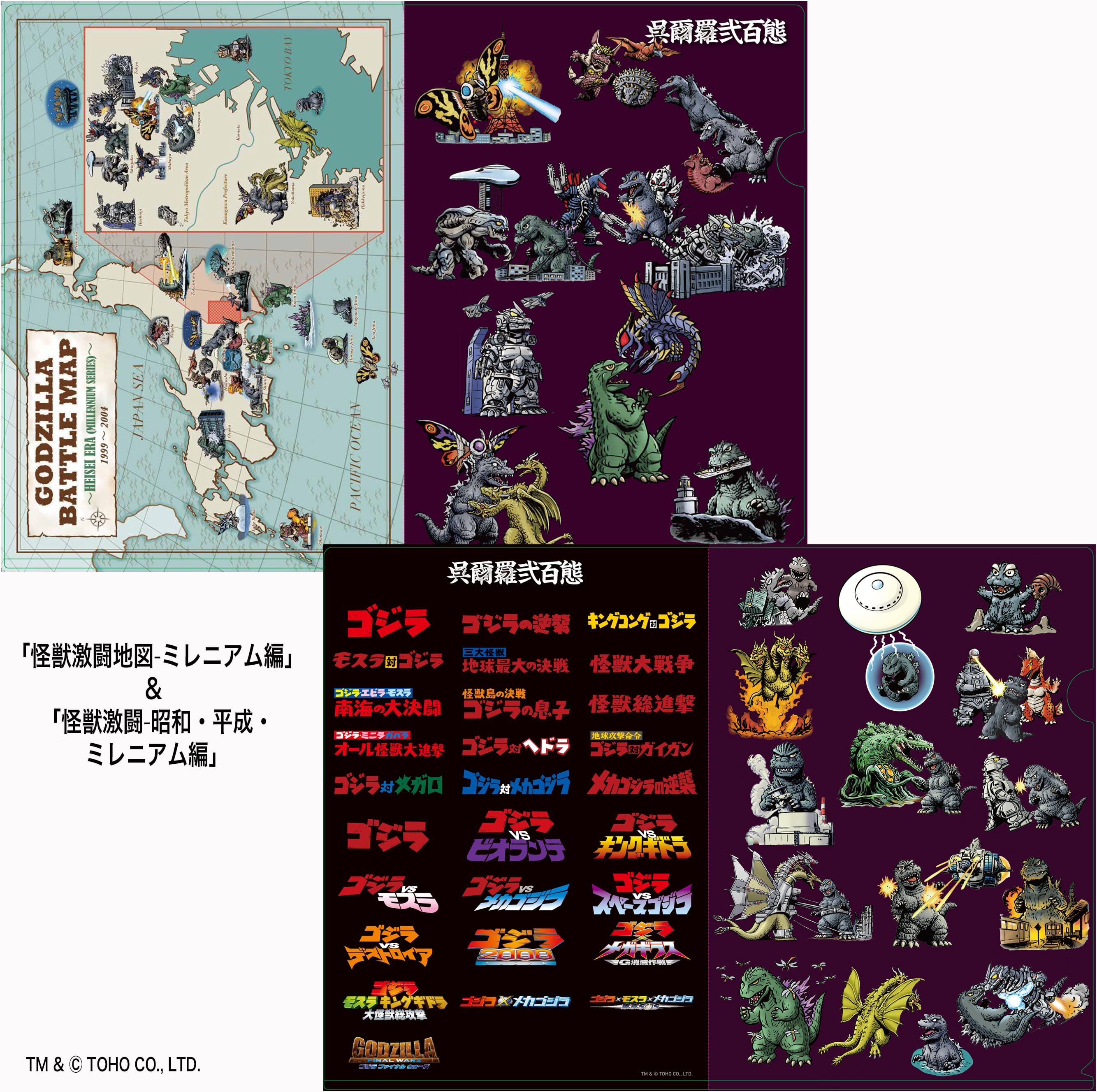 最新作です。ミレニアム編の怪獣激闘地図をクリアファイル化。さらに、昭和編と平成編、ミレニアム編の28作品のロゴと名場面セレクトのセットです。